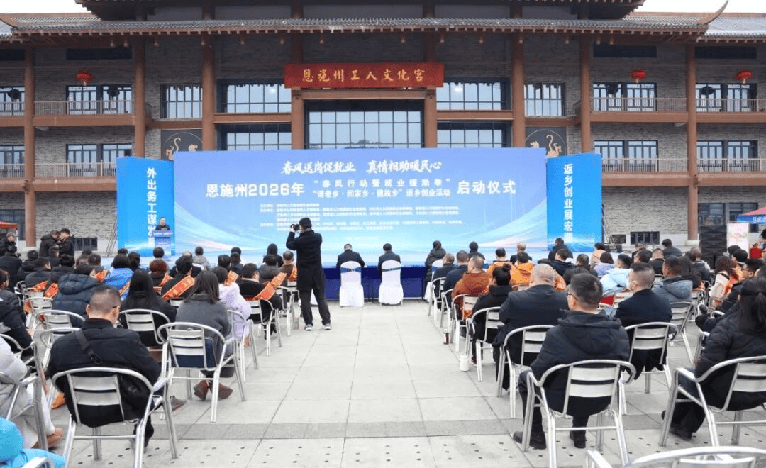 恩施州恩施市总工会结合州人社局等相关单元举办的恩施州2026年“春风步履暨就业援帮季”“请老乡·回家乡·建家乡”返乡创业勾当正在州工人文化宫广场启幕。
